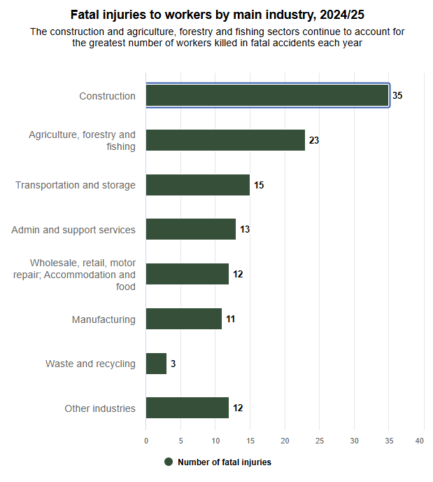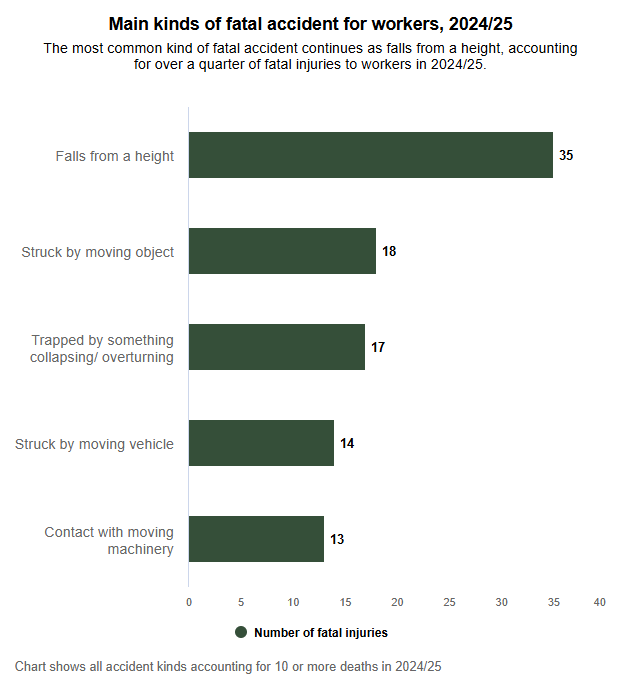 - The Enduring Threat of Falls from Height: Alarmingly, falls from height remained the leading cause of fatal injuries, accounting for 35 deaths – over a quarter of all worker fatalities in 2024/25. T