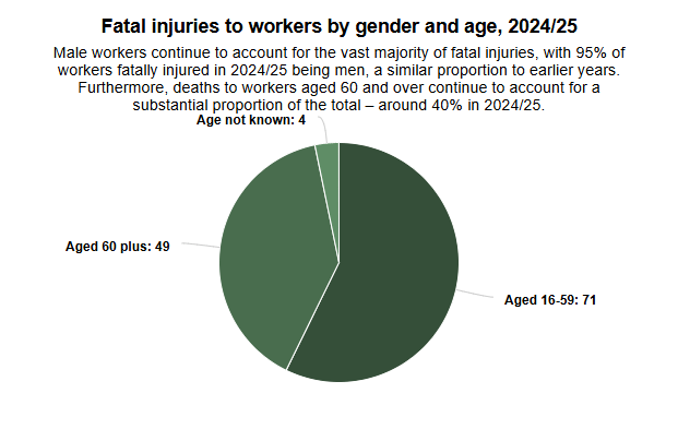- Vulnerable Workers and the Public: The data also showed a disproportionate impact on certain groups. Workers aged 60 and over accounted for approximately 40% of fatal injuries. Similarly, 49 of the 124 fatalities involved self-employed individuals.